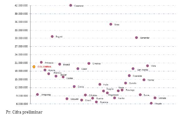 En el periodo analizado, en 20 departamentos el producto per cápita creció por encima del promedio nacional, pero solo ocho regiones obtuvieron en 2018pr un resultado superior al del total del país, que en su orden correspondieron a Casanare, Meta, Bogotá, Santander, Antioquia, Cundinamarca, Boyacá y Valle (gráfica 14).
