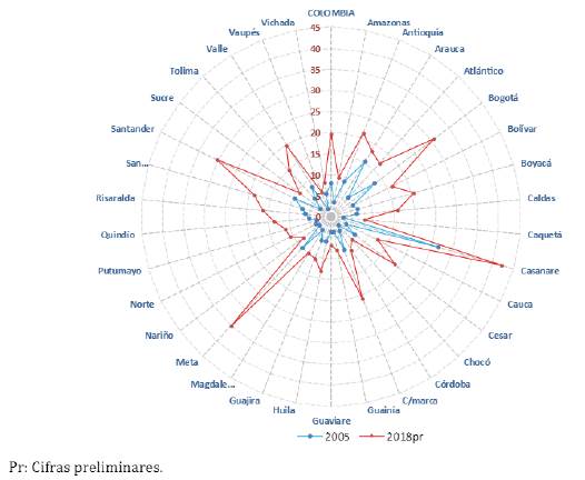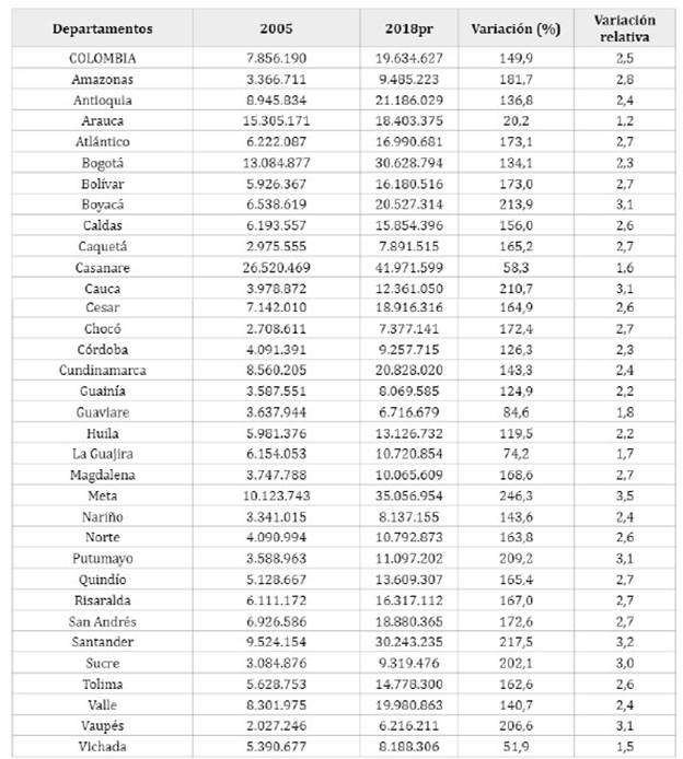 La dinámica de la economía colombiana entre 2005 y 2018 evidencia un despegue, durante el periodo de análisis, en la generación de PIB para gran parte de las regiones del país. En la tabla 7 se aprecia que, en un periodo cercano a los tres lustros, este indicador de bienestar se triplicó en siete departamentos (Boyacá, Cauca, Meta, Putumayo, Santander, Sucre y Vaupés) y creció a un ritmo moderado en Arauca (20,2%), Casanare (58,3%) y Vichada (51,9%). En el resto de departamentos se aprecia, en la mayoría de los casos, un crecimiento progresivo y no menos significativo.