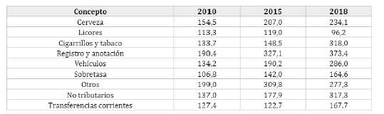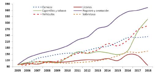 Entre 2005 y 2018, la dinámica de estos impuestos ha sido interesante pues, salvo el retroceso que viene presentando el impuesto a los licores, puede decirse que en casi todos los casos su crecimiento ha superado al de las transferencias corrientes. Llama la atención la evolución del impuesto de registro y anotación, que, como resultado de la intensificación de las actividades de construcción, el redimensionamiento de las ciudades y centros poblados y el aumento significativo de las transacciones inmobiliarias durante el periodo de estudio, ha venido creciendo aceleradamente hasta lograr en el 2018 ser 3,7 veces el recaudo del 2005 (aumento de 273,4%). Por su parte, el impuesto a cigarrillos y tabaco aumentó en 218,0% (3,18 veces) y el de vehículos automotores creció en el mismo lapso en 186,0% (2,86 veces el recaudo de 2005); finalmente, el impuesto a la cerveza creció 134,1%, es decir, 2,34 veces lo recaudado en el 2005 (tabla 1).