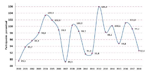 Puede apreciarse que la estructura económica del país se ha mantenido prácticamente estable desde el 2000, lo que la hace ser homogénea y resistente a las transformaciones endógenas y exógenas a las que ha estado sometida durante casi dos décadas. Ello implica que la dinámica productiva, los cambios institucionales, los choques externos como el ocasionado por la crisis financiera internacional del 2008, los cambios en la regulación y las reformas tributarias efectuadas con cierta periodicidad, entre muchos otros cambios, no han alterado la composición productiva regional del país.