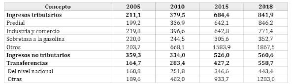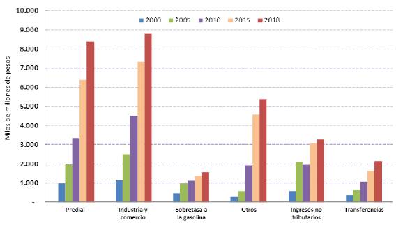 La dinámica del ingreso municipal puede verse reflejada en la tabla 4, en la que se aprecia cómo los recursos tributarios crecieron 8,41 veces entre el 2000 y el 2018, mucho más que los ingresos no tributarios y las transferencias corrientes, impulsados por el comportamiento del predial, industria y comercio, así como un conjunto significativo de tasas e impuestos considerados de menor cuantía pero que en conjunto recaudaron, en 2018, $5396,0 miles de millones de pesos1.