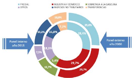 Nótese cómo cambió la composición de los ingresos comentes de los municipios entre los años 2000 y 2018. En la gráfica 5 puede observarse cómo el impuesto predial pasó de representar un 25,8% de las rentas habituales de los municipios en el 2000 (círculo externo en la gráfica) a participar con el 28,4% en el 2018 (círculo interno de la gráfica), en tanto los otros impuestos cambiaron su representatividad de 7,5% a 18,3% en el mismo lapso.