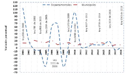 La necesidad de financiamiento descrita para solventar el gasto público ha estado ligada a la expedición de reformas tributarias sucesivas a partir del 2000, convirtiéndose en una tradición que viene de años anteriores. Desde entonces se han aprobado por parte del Congreso 11 reformas tributarias hasta la fecha, es decir, una relación de 1,63 por año, y no es del todo evidente que estas hayan promovido el aumento de los ingresos tributarios locales, en la medida en que gran parte de las nuevas leyes se han concentrado en el fortalecimiento de los impuestos nacionales, la eliminación de complejidades administrativas y operativas del sistema tributario, la eliminación de impuestos para promover la competitividad de los productos nacionales en el exterior e intentar equilibrar las disparidades y desequilibrios que tiene el sistema (gráfica 6).