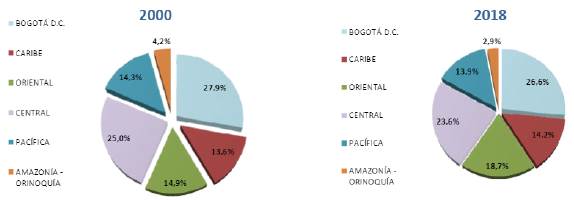 Contrario a esto, las regiones del país de menor tamaño siguen siendo los antiguos territorios nacionales (región de la Amazonía-Orinoquía], que en el 2000 tenían un PIB de $13.580 miles de millones y en 2018 de $27.503 miles de millones, es decir, 1,8 veces mayor, equivalente tan solo al 11,0% de la región más grande (Bogotá) y al 2,8% del PIB de Colombia en dicho periodo.