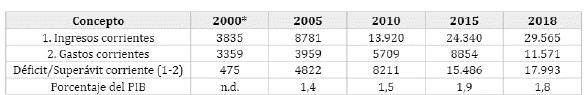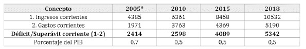Ahora bien, el comportamiento de los ingresos corrientes en contexto con el financiamiento de los departamentos evidencia un relativo equilibrio fiscal de estas entidades territoriales. Mientras estos recursos crecieron entre 2005 y 2018 en 140,2%, al pasar de $4385 miles de millones de pesos a $10.532 miles de millones de pesos, los gastos corrientes aumentaron en 163,3%, al tener un valor de $1971 miles de millones de pesos en 2005, hasta llegar a $5190 miles de millones de pesos en 2018. Lo anterior significó que a este nivel las gobernaciones generaron durante todo este ciclo sucesivos superávits fiscales del orden del 0,5% del Producto Interno Bruto. Es así como en 2005 el superávit fiscal comente fue de $2414 miles de millones de pesos y en 2018 de $5342 miles de millones de pesos (tabla 2).