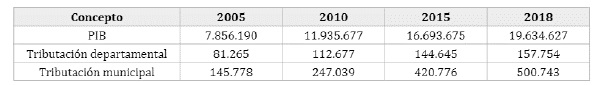 Por otra parte, como resultado de las sucesivas reformas tributarias, el gobierno nacional ha visto crecer la proporción de ingresos tributarios en relación con el producto. Esta relación se duplicó entre 1985 y 2014, al pasar de 7,5% del PIB a 14,1% (Concha, Ramírez y Acosta, 2017, p. 5). Y si bien dicho esfuerzo fiscales menor al de otros países del continente, sí muestra en un lapso corto un impacto regresivo significativo sobre la creación de valor agregado que bien vale la pena analizar, en la medida en que la descentralización fiscal le ha otorgado autonomía a las entidades territoriales, bien como departamentos o municipios, para administrar y crear sus propias rentas con independencia de las generadas a nivel nacional (las cuales tienen su propia dinámica). Por tanto, para analizar el impacto de los impuestos a cargo de las entidades territoriales en el crecimiento económico de las regiones, con independencia de la canasta de impuestos nacionales, en la sección siguiente se adelantará una descripción detallada de la dinámica y el impacto de los tributos en los departamentos y los municipios, y del estado general de las economías regionales, a fin de describir la forma en que estos inciden en la actividad.