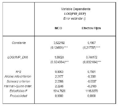 Los resultados de ambas estimaciones se presentan en la tabla 9. La estimación del modelo bajo (MCO) en el panel [pooled] determina que los impuestos territoriales (municipales y departamentales) inciden en al menos 1,09% en el crecimiento económico departamental; por ello, siendo los coeficientes significativos en términos estadísticos y teniendo este proceso un valioso grado de ajuste, redefinido en términos de los resultados obtenidos, queda expresado así: