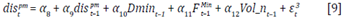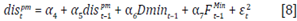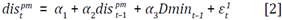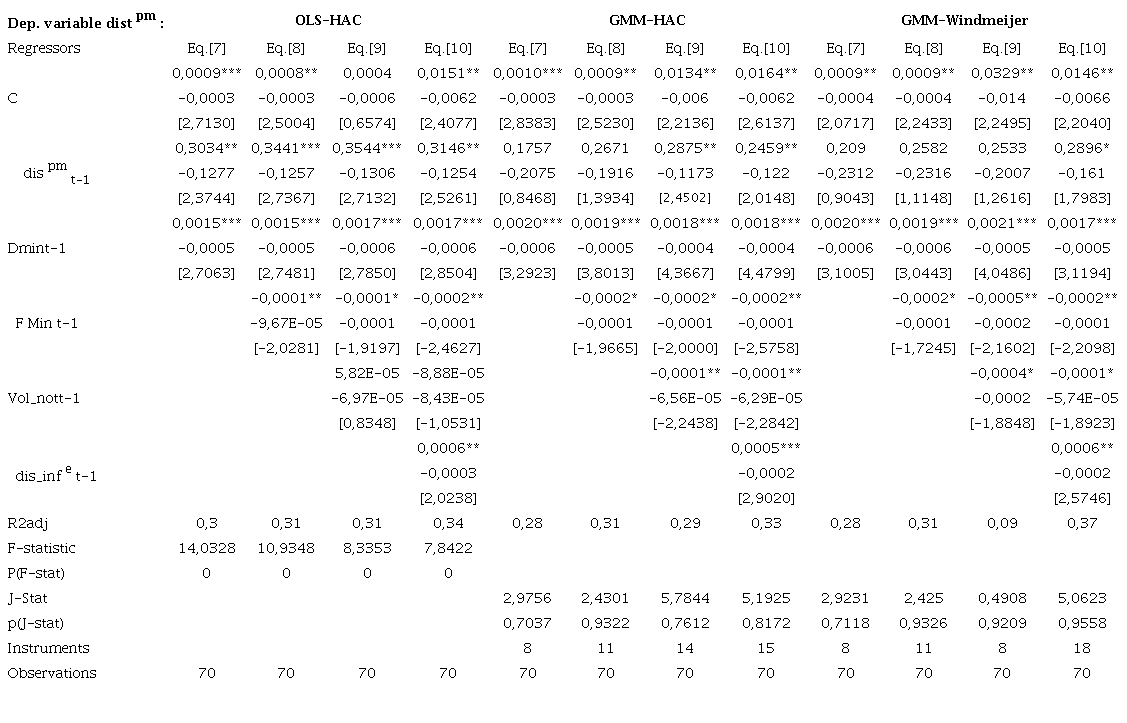 Donde distpm es el desacuerdo de la tasa de interés de política monetaria y dist-1pm es un rezago del desacuerdo. Este rezago es agregado con el fin de capturar el hecho de que el desacuerdo puede persistir en el tiempo, como resultado de la rigidez en la información inherente a cada tipo de agente. Esta rigidez implica la existencia de heterogeneidad entre los pronosticadores, causada por la capacidad de cada agente para entender la estructura de la economía agregada, la velocidad de aprendizaje o adaptación frente a los nuevos acontecimientos económicos, como también sus limitaciones para acceder y procesar la información (ver, por ejemplo, Mankiw y Reis, 2002; Woodford, 2003; Evans y Honkapohja, 2009; Coibion y Gorodnichenko, 2012). Por su parte, Dmint1 captura el desacuerdo entre los directores en la última reunión de la junta directiva del banco central y E1 corresponde al término error.