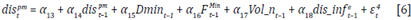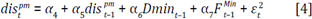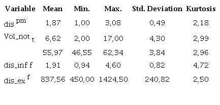 Donde distpm es el desacuerdo de expectativa de tasa de interés de política monetaria realizado en el tiempo , que es el momento en el que el pronóstico es realizado por el agente i con i ∈ I, siendo I el conjunto de agentes encuestados. La variable pronosticada es X (para este caso la de interés anual) y E.tXa+i representa el pronóstico que realiza el ith agente en el tiempo t acerca del valor que tomará la variable X al final del periodo a + j. El promedio de la distribución de las expectativas calculadas por el conjunto de agentes I en el tiempo t acerca del valor que tomará X, al final del periodo a + j se define como EtXa+j = 1/I ΣEft Xa+j. Así, EtmaxXa+j = max (Eit Xa+j, i ∈ I) denota el máximo valor, mientras que EminXa+j = min (Ei,t Xa+j, i ∈ I) denota el mínimo valor pronosticado del conjunto de agentes.