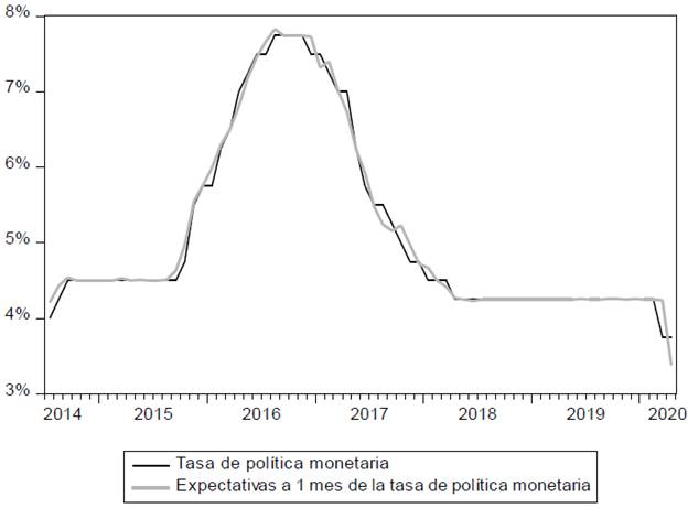 Como una primera forma de verificar si existen desacuerdos en el pronóstico de la tasa de interés, en la Figura 1 se muestra el comportamiento de la tasa de interés del banco central y la media de las expectativas a un mes de dicha tasa que hacen los agentes del mercado financiero sobre la tasa para el periodo 2014/07-2020/03.