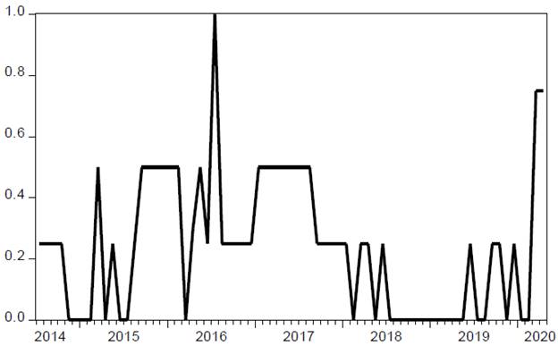 De acuerdo con la Figura 2, el desacuerdo en las expectativas no presentó una tendencia definida a lo largo de la muestra y tuvo un promedio de 0,24 puntos básicos. Se identifican dos subperiodos. El primero, entre 2015-2019/05, alcanza un promedio de 0,27 puntos básicos y se caracteriza por presentar una tendencia creciente y el valor más alto para toda la muestra de 0,10 puntos básicos en 2016/07. Luego inicia una tendencia decreciente para finalizar sin desacuerdos en 2018 y parte de 2019. Un segundo subperiodo es identificado entre 2019/06-2020, con nuevos incrementos en el desacuerdo, con un valor máximo de 0,75 puntos básicos en 2020/04.