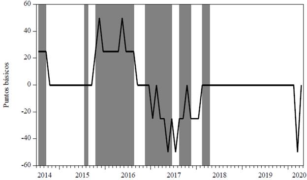 En la Figura 3 se relacionan las variaciones de la tasa de política monetaria y los desacuerdos entre los directores. La sombra de color gris especifica las reuniones con decisiones tomadas por mayoría y en blanco las decisiones unánimes. Es posible identificar que los desacuerdos entre los directores se originan cuando las decisiones implican iniciar una postura de política. Por ejemplo, entre 2015-2016, las decisiones estuvieron enmarcadas por una política monetaria contractiva, como señal de preocupación por el desanclaje de inflación. En el 2017 los desacuerdos se originan sobre un entorno bajo decisiones que se inclinan hacia una política monetaria expansiva, como señal de una preocupación por impulsar la actividad economía, una vez controlada la inflación. De forma contraria, se destaca que en los periodos en los cuales no hay variaciones en la tasa de política, todo el conjunto de directores siempre alcanzó un consenso.
