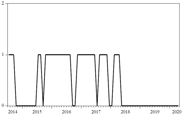 En la Figura 4 se muestra el comportamiento de la variable Dmin. En la Figura se puede identificar que entre 2014-2018/04 ocurrieron sucesivas decisiones de política monetaria tomadas por mayoría. Sin embargo, desde 2018/05, hasta el final de la serie, todas las decisiones fueron tomadas de forma unánime, siendo el periodo más prolongado sin desacuerdos entre los miembros del Banco Central de Colombia.