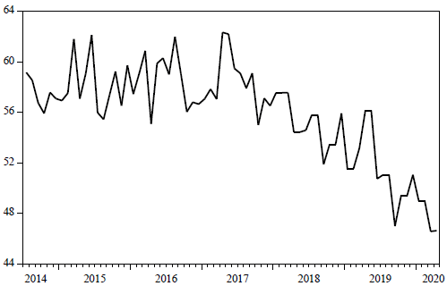 En la Figura 5 se presenta la evolución del índice Inflesz para las minutas del banco central de Colombia. Se destacan dos momentos para la muestra de análisis. De forma inicial, entre 2014-2017, el índice presenta movimientos en un rango entre 56 y 62,34. Esto significa que las minutas podían ser entendidas por público con al menos una educación primaria. Un segundo momento se origina entre 2018 y 2020, con una reducción importante en la legibilidad hasta alcanzar el nivel más bajo en 46,55. Como resultado, la legibilidad de las minutas alcanzó la escala numérica más baja en la muestra y, en consecuencia, la educación mínima para entender los anuncios del banco central de Colombia.