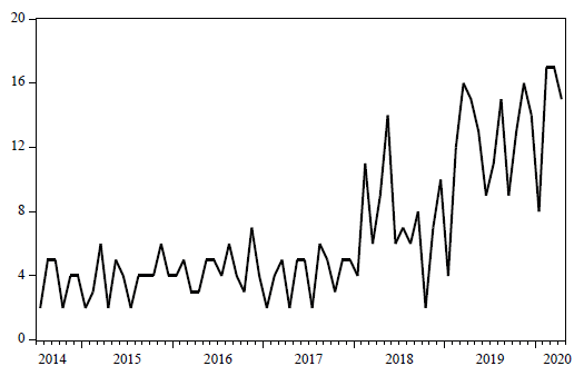 En la Figura 6 se observa el comportamiento del volumen de noticias del Banco Central de Colombia relacionadas con la gestión de la política monetaria, publicadas en la página web (https://www.banrep.gov.co/es/noticias-y-publicaciones), a través de la sección Noticias y publicaciones. La Figura permite identificar dos periodos. Un primer periodo entre 2014-2017, con un promedio mensual de cuatro noticias publicadas. Sin embargo, entre 2018-2020 se observa un incremento importante, alcanzando un promedio de 10,5 noticias publicadas por mes. En suma, se observa un mayor esfuerzo del banco central por informar al público sobre sus acciones de política monetaria.