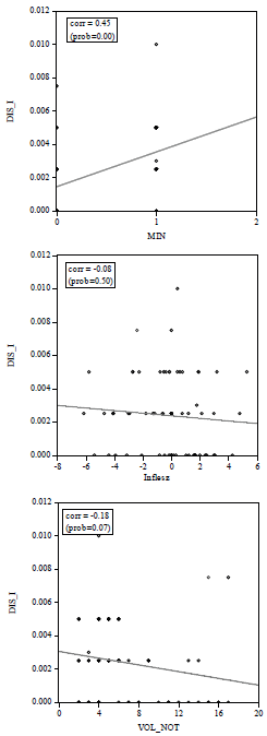 Como una primera aproximación a la relación entre comunicación y desacuerdos, en la Figura 7 se presentan gráficos de dispersión con la línea de regresión y la correlación de los desacuerdos en la tasa de interés y los tres instrumentos de comunicación del banco central. Se observa inicialmente que el desacuerdo de las tasas de interés tiene una correlación positiva con los desacuerdos de los directores del periodo anterior (0,45) y dicha correlación es significativa al 1%. Es decir, las decisiones que se toman por mayoría y evidencias discrepancias entre los miembros de la junta directiva en el pasado sí podrían tener alguna incidencia en los desacuerdos del mercado. Por su parte, se encuentran correlaciones negativas para la legibilidad (-0,08) y para el volumen de noticas sobre las decisiones de política monetaria (-0,18) con relación a los desacuerdos. No obstante, la correlación con la variable legibilidad no fue significativa, mientras que la asociada al volumen de noticias es significativa al 10%. En suma, esta primera evidencia empírica permite afirmar que la comunicación sí podría afectar los desacuerdos del mercado.
