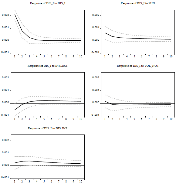 De acuerdo con la Figura 8, la respuesta del desacuerdo a un choque del rezago disp_1 es positiva y significativa. Esto significa que a través del tiempo se mantienen las diferencias en la velocidad de ajuste de las expectativas sobre el comportamiento futuro de la tasa de interés de política monetaria. Además, plantea la necesidad de aumentar la comunicación para mitigar el problema de la rigidez de la información entre los agentes. Este resultado corrobora el hallazgo presentado en la Tabla 2, en el cual el desacuerdo tiene efectos en todos los modelos presentados.