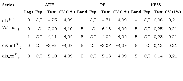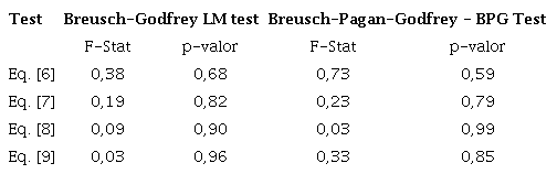 De forma inicial son realizados los tests para evaluar raíz unitaria de Dickey-Fuller aumentado (ADF) y el test Phillips-Perron (PP), y para evaluar estacionariedad es realizado el test de Kwiatkowski-Phillips-Schmidt-Shin (KPSS). El criterio de decisión para determinar la orden de integración fue la convergencia entre el resultado del test KPSS y, por lo menos, uno de los otros dos tests (ADF o PP). Con base en los resultados de los tests, las variables a utilizar en las ecuaciones [6]-[9] son todas integradas de orden cero y serán utilizadas en niveles. Los resultados son presentados en la Tabla A.3 del Apéndice. Además, fueron realizados los test de Breusch-Godfrey (LM) y Breusch-Pagan-Godfrey (BPG) para evaluar correlación serial y heterocedasticidad. Según los resultados, los modelos no presentan problemas (ver Tabla A.4 del Apéndice).