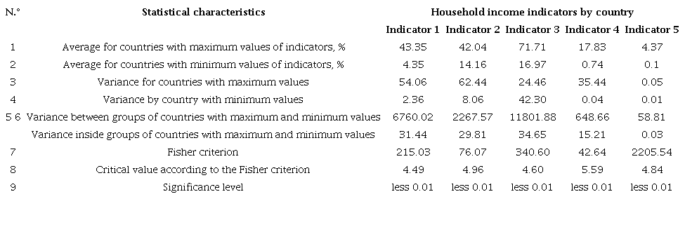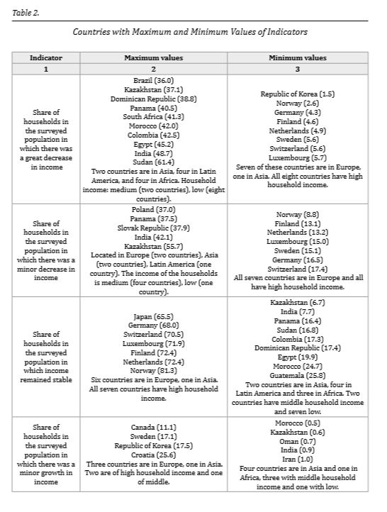 The information given in the second and third columns of Table 2 allows us to draw conclusions about the geographical location of the countries with maximum and minimum values for each of the five indicators under consideration, as well as about the level of income of the population in these countries. Analysis of this information showed that the minimum values of the household weights in which both a strong and a slight decrease in income was observed [the first and second indicators] were in countries located in Europe. Only one country, Republic of Korea, is in Asia. All these countries are characterized by a high level of income of the population. The maximum values of the third indicator describing the specific weights of households that retained their incomes were observed in European countries, as well as in Japan. All these countries are characterized by high income levels. The maximum and minimum values of the fourth and fifth indicators, the maximum values of the first and second indicators, as well as the minimum values of the third indicator were registered in countries located in different parts of the world and characterized by different levels of income.