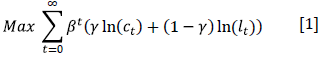 For calibrating у we assume there are 16 available daily hours for distributing among leisure and working; this way, economic agents have 112 weekly available hours. According to the data presented in Table 2, Mexican workers decide to spend on average 51.6608 weekly hours working and consequently 60.3392 weekly hours on leisure, therefore l = 0.5387. Following Equation [17], being aware that Iw is the monetary value of leisure time, w = RH, and using annual data -same results as with hourly data- we obtain γ = $95,846.6 / (0.5387 * 0.8418 * $307,838.8 + $95,846.6) = 0.4071.