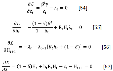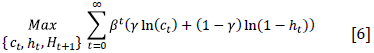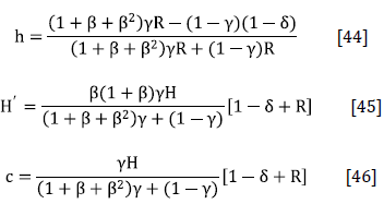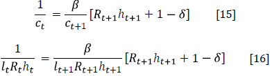 As usual, the optimal allocation of resources across time requires the marginal utility of consumption at any period t (Equation [15]) to be equal to the discounted marginal utility of consumption at period t + 1, multiplied by the marginal productivity of human capital plus one minus the depreciation rate. An analogous interpretation should be provided to the marginal utility of leisure (Equation [16]).