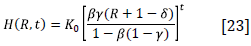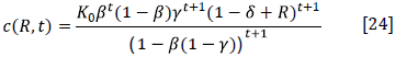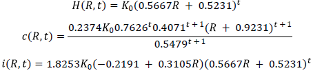 By substituting Equations [5] and [23] in [12], we get the temporal path of consumption [c(R, t)] as a function of the exogenous state variable (R), time, and the parameters