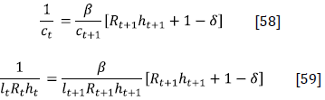 By solving for λt in Equations [54] and [55], and substituting the results in Equation [56], the Euler equations with respect to consumption and leisure are obtained