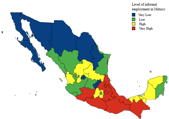 Figure 1 shows on the map of Mexico the groups of states by level of informality described in Table 1. It can be seen that the northern region of Mexico is home to a large number of states in the Very Low informality group. The greater number of formal jobs with respect to the total labor market is largely due to the presence of the manufacturing sector in the region. On the other hand, the south and southeast of Mexico have a greater number of informal jobs than the other regions. This is due to the fact that there is more informal trade and tourism-related activities in the region.