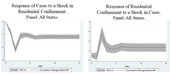 For the first graph in Figure 2, the COIRFs were made by including all 32 states in the panel. We can see that the unanticipated momentum of residential concentration causes a negative response in cases that stabilizes in the seventh period. It is important to note that, for this graph, the response starts from zero, indicating that a higher concentration in residential areas does not have immediate effects, but rather they tend to appear and stabilize after one week. On the other hand, the second graph in Figure 2 represents the response of the residential concentration to an unanticipated surge of cases. In this case, the response is positive and different from zero since the beginning of the shock. This confirms the importance of clearly communicating the surge in cases so that people can become aware of the pandemic. Importantly, for the COIRFs to be statistically significant, the confidence interval must exclude zero over the estimated time horizon. This confirms that staying at home has combated the spread of the virus, and for an increase in the number of cases, people respond by staying more in residential areas. Modeling with PVAR the relationships between infections and residential isolation offers the possibility of verifying the direction of the effects, while a linear model would not be clear about causality.