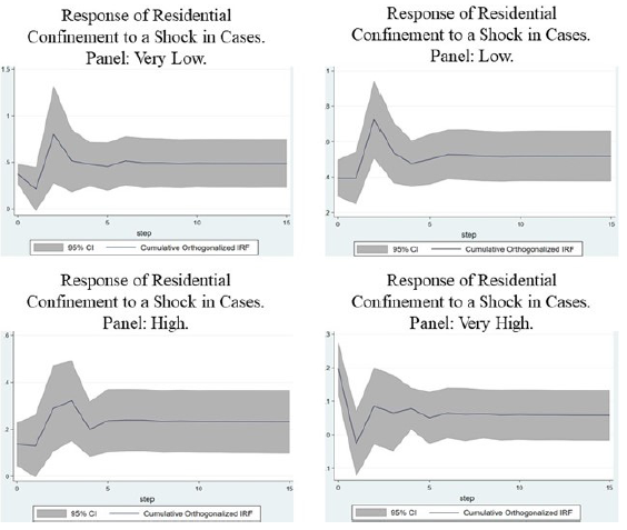 In this direction, when evaluating how the impulse to residential confinement responds to a growth shock in the confirmed cases of COVID-19, Figure 4 shows that only the groups of high, low, and very low informality register a positive effect. That is, as the spread of the virus increases, people tend to stay more at home. Again, it can be seen that as informality decreases in the groups, the effect is greater. That is, the lesser the informality, the greater the possibility of staying at home to avoid infection. Unfortunately, for the group with very high informality there is no clear evidence.