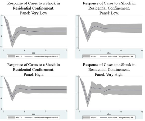 Separating states by groups of informality produces heterogeneous results. Figure 3 shows the impulse response functions of the growth in cases of residential isolation shock.