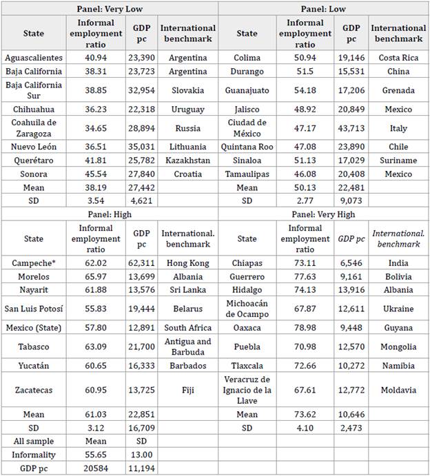Table 1 shows Mexican states separated by their level of informality (Very Low, Low, High & Very High). For each panel, the first column shows the state, the second column shows the proportion of workers who are in the informal sector, the third column shows the state's GDP per capita in international dollars in 2019, and the fourth column gives an international comparison (with respect to GDP per capita in 2019). The last two columns are intended to show the heterogeneity of wealth across states. At the end of each panel the mean and standard deviation of each group is reported, and at the end of the table these two descriptive statistics are also reported for the 32 states. It is important to mention that Campeche has those values for oil production.