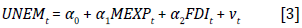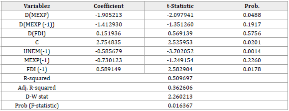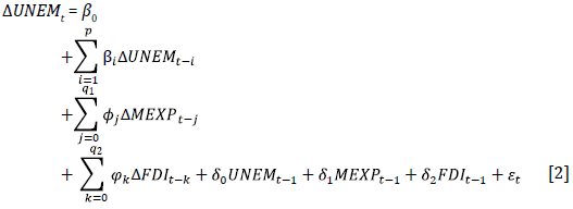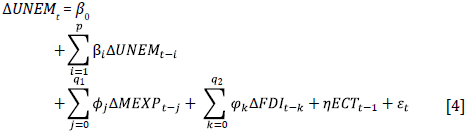 Where, ECTt-1 = (UNEMt-1 - a0 - a1MEXPt-1 - a2FDIt-1) and a's are the OLS estimates of the a's in Equation (3).