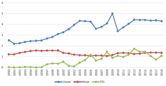 The dependent variable of this study is unemployment, while the main independent variable is military expenditure. Foreign direct investment (FDI) is used as a control variable.