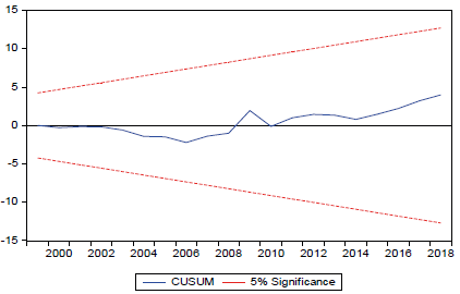 It is imperative to check for serial correlation and model stability if we want to proceed with the ARDL model estimation. When the residuals are correlated there is serial correlation and the estimates will be biased and inconsistent. The Breusch-Godfrey or Langrage Multiplier (LM) test is applied in this study to test serial correlation. The LM test assumes a null hypothesis of no serial correlation. Table 5 shows the results of LM test. The the p-value of the LM statistic assigns a probability of rejecting null hypothesis of about 58%. It means that we cannot reject the null hypothesis of no serial correlation. Thus, the model is free from serial correlation problem.