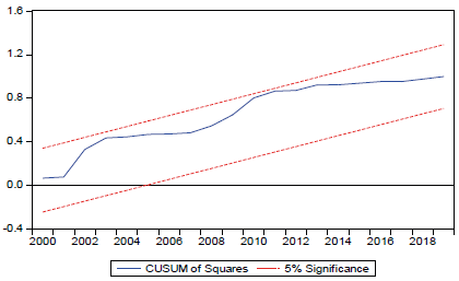 When the parameters remain constant over time there is stability. The CUSUM and CUSUM of square test is used to evaluate the stability of the model on the recursive residuals. While the CUSUM test detects the systemic changes from the coefficients of regression, the CUSUM of square test identifies sudden changes from the constancy of regression coefficients. The results of both tests are shown in Figures 2 and 3. The results reveal that the statistics of both tests lie within the red lines at a 5% confidence interval. Therefore, we can conclude that the model is stable.