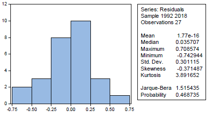 The null hypothesis cannot be rejected if the value of the Jarque-Bera statistic is greater than 5%. Otherwise, the null hypothesis would be rejected. In our case, the null hypothesis cannot be rejected at 5% level of significance according to the Jarque-Bera statistic. So, the residuals of ARDL model are normally distributed over the study period. This confirms the validity of the ARDL model. The figure of Normality test is presented in the figure 4.