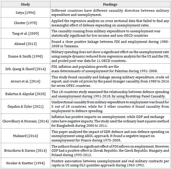 The existing literature showed that there are many factors that cause unemployment. Numerous previous studies have examined the factors contributing to unemployment, however empirical studies on the impact of military expenditure on unemployment in the context of Bangladesh are still rare. In the existing literature, there is no consensus on the relationship between military expenditure and unemployment. While some studies have suggested that military expenditure leads to increased unemployment, other have found either a positive association or no significant relationship between them. For example, Chester (1978) conducted a study on the effect of military expenditure on unemployment rates for eight OECD countries. He applied regression analysis to cross sectional data and failed to find any meaningful effect of defence spending on unemployment rates. However, Tang et al. (2009) found that causality running from military expenditure to unemployment was statistically significant for low income and non-OECD countries when military expenditure was measured by military burden. Besides, it was statistically insignificant when measured by per capita expenditure for 23 OECD and 23 non-OECD countries from 1988 to 2004. In addition, Kollias et al. found that the increase in the USA's military expenditure led to a rise in the level of unemployment. The evidence, which was supported by quantile regression with disaggregated data from 1948 to 2017 was applicable across all unemployed persons (Kollias et al., 2020).