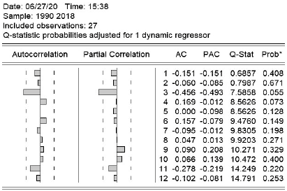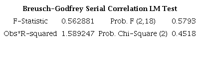 To further test that the residuals are serially independent we also apply the correlogram Q-statistic. Though the p-value is approximate, the results strongly suggest that there is no autocorrelation. The results are shown in Table 6.