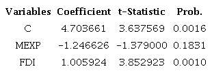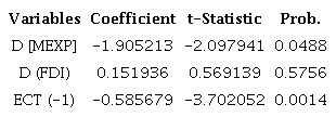 Finally, we measure the long run effects from the unrestricted ECM; from Equation (2), the long run coefficients for MEXP and FDI can be obtained. We also conclude the short run dynamics and form the final restricted ECM specified in Equation (4).