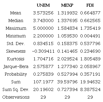 This part presents the statistical description of three variables: unemployment, military expenditure, and foreign direct investment. A detailed description of the raw data set is provided in the form of descriptive statistics in Table 2. The time series data consists of 29 observations spanning from 1990 to 2018. The table displays the observation's mean value, standard deviation, maximum value, minimum value, and corresponding probability value of Jarque-Bera.