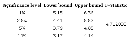 Sixth, we perform the F-test or Wald test to find evidence of a long-run relationship among the variable under the null hypothesis, H0: δ0 = δ1 = δ2 = 0, against the alternative that H0 is not true. However, the asymptotic distributions of the test (F-test) statistics are non-standard. Thus, we can't use the exact critical values from the standard F distribution. However, Pesaran et al. (2001) supply bounds on the critical values for the asymototic distribution of the F-statistic. The upper bound is constructed under the situation when all the variables are I (1), and the lower bound when they are all purely I (0). If the computed F-statistic falls below the lower bound we would conclude that the variables are I (0), which indicates that no cointegration is possible. If the calculated F-test statistic exceeds the upper critical bound, we conclude that we have cointegration. However, the results will be inconclusive if the F-test statistics falls between the upper and lower critical bounds.