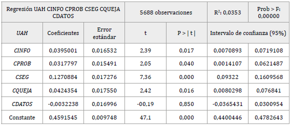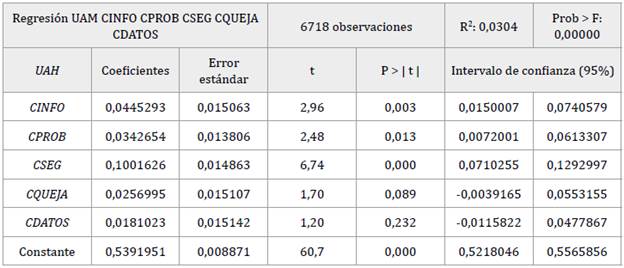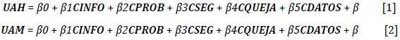 Se realizó el modelo econométrico propuesto (UAH = β0 + β1CINFO + β2CPROB + β3CSEG + β4CQUEJA + β5CDATOS + ε y UAM = ß0 + β1CINFO + β2CPROB + β3CSEG + β4CQUEJA + β5CDATOS + ε) para evaluar los resultados arrojados con base en las 12.406 observaciones correspondientes a la ENIF 2021.