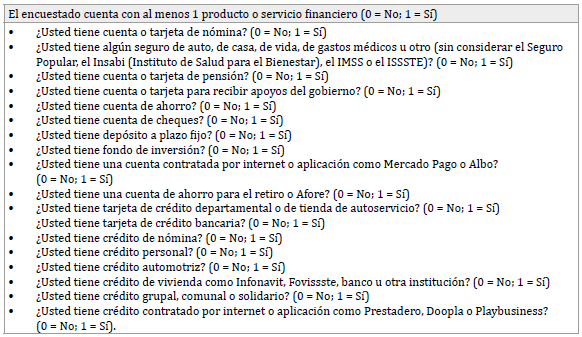 Se tomaron 12.406 observaciones (5.688 hombres y 6.718 mujeres) correspondientes a las preguntas respondidas por personas encuestadas entre 18 y 70 años dentro de la ENIF del año 2021. Se realizó un constructo de 17 preguntas de la encuesta para obtener una variable dependiente única que represente al uso y acceso de productos y servicios financieros, tanto en hombres como en mujeres (Tabla 1).