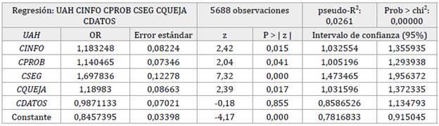 CPROB: indica la probabilidad de éxito de la variable dependiente (UAH/ UAM) cuando el valor de la confianza en la resolución de problemas y necesidades económicas (CPROB) es igual a uno, y los valores de la confianza en recibir la información necesaria (CINFO), en la seguridad del dinero (CSEG), en la atención y resolución de quejas (CQUEJA) y en la protección de datos personales (CDATOSS) son iguales a cero.