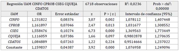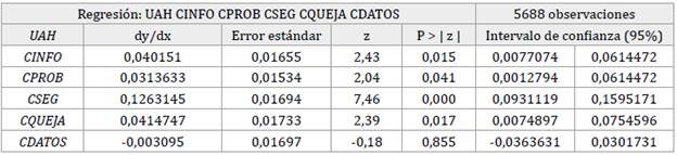 CINFO: indica la probabilidad de éxito de la variable dependiente (UAH/ UAM) cuando el valor de la confianza en recibir la información necesaria (CINFO) es igual a uno, y los valores de la confianza en la resolución de problemas y necesidades económicas (CPROB), en la seguridad del dinero (CSEG), en la atención y resolución de quejas (CQUEJA) y en la protección de datos personales (CDATOS) son iguales a cero.