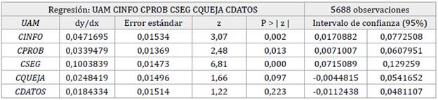 • el cambio en puntos porcentuales de la probabilidad de usar y tener acceso de productos y servicios financieros (UAH/UAM = 1) cuando el usuario tiene la confianza de que la institución financiera resolverá sus quejas y reclamaciones (CQUEJA = 1).