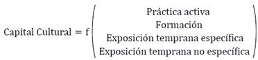 El capital cultural se considera una variable sintética con cuatro dimensiones, y en un segundo lugar del estudio se descompone en cada uno de los elementos que dan contenido a las dimensiones de la variable sintética como variables individuales independientes. Throsby (2003) define el capital cultural como "activo que incorpora, almacena o genera un valor cultural más allá de cualquier valor económico que posee" (p. 133); mientras para Bourdieu (1987), es la capacidad del individuo que facilita la apreciación cultural. En este estudio, el capital cultural es un recurso individual, es una característica del individuo, por ello se opta por la definición del Bourdieu, que es la que más se ajusta al objeto del trabajo.