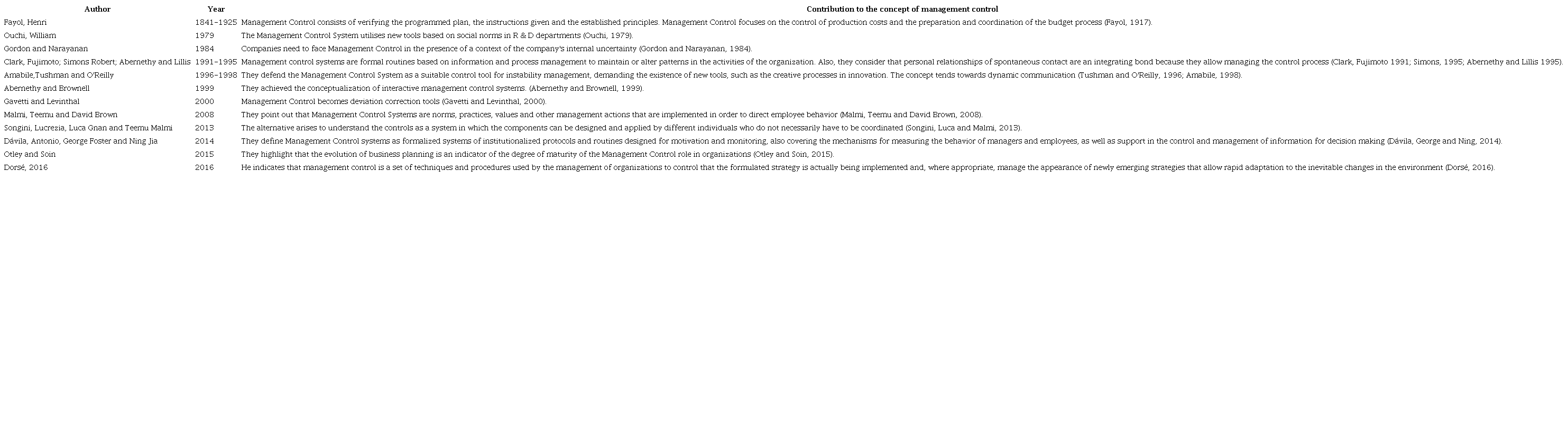 Before the 1980s, Management Control consisted of monitoring production costs, preparing and coordinating the budget process so that it would be fulfilled (Fayol, 1917). Table 1 lists the leading and most relevant scholars on this topic and their contributions. According to Dorsé (2016), a management solution and control system is a set of techniques and procedures used by the management of organizations to control that a formulated strategy is actually being implemented and, where appropriate, to manage the arrival of new emerging strategies that allow rapid adaptation to inevitable changes in the environment.