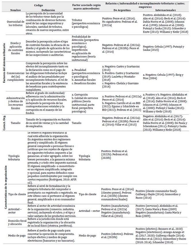 Trabajos anteriores estudian la informalidad empresarial en Argentina, con diferentes abordajes. Los estudios cuantitativos que analizan la informalidad en mipymes argentinas desde la perspectiva de los empresarios evidencian que la subdeclaración de ingresos es un fenómeno multicausal con diversos factores determinantes, que comprende tanto elementos del entorno (corrupción, regulación y burocracia, calidad de los servicios públicos, probabilidad de detección, informalidad del sector e inestabilidad política, entre otros) como características de las propias organizaciones (principalmente tamaño, forma legal, actividad, tipo de clientes, financiamiento, género del empresario, presión tributaria que afronta) (Pedroni et al., 2022a, 2022b; Villar et al., 2015; Pesce et al., 2014). Hallazgos similares reportan los trabajos que estudian el tamaño y los determinantes de la subdeclaración de ingresos en empresas argentinas registradas desde la percepción de profesionales en ciencias económicas (Pedroni et al., 2020b).